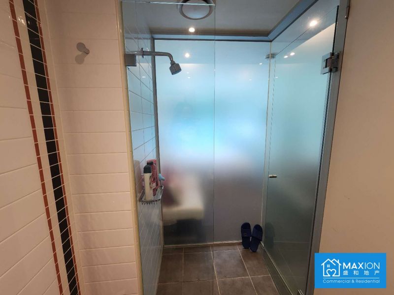 Bathroom: A modern walk-in shower with floor-to-ceiling tiles and frosted glass.