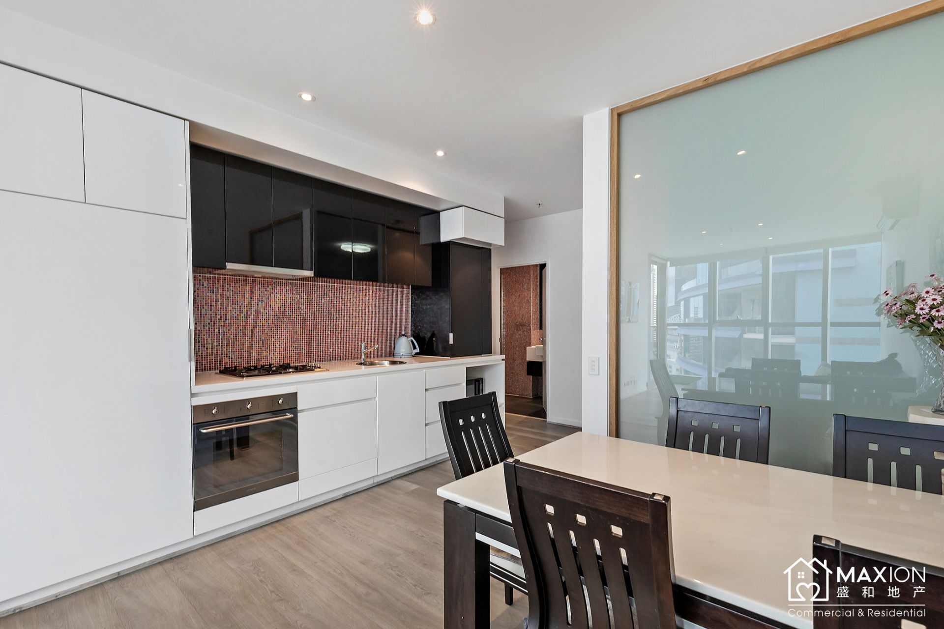 Designer kitchen with stone benchtops and stainless-steel appliances