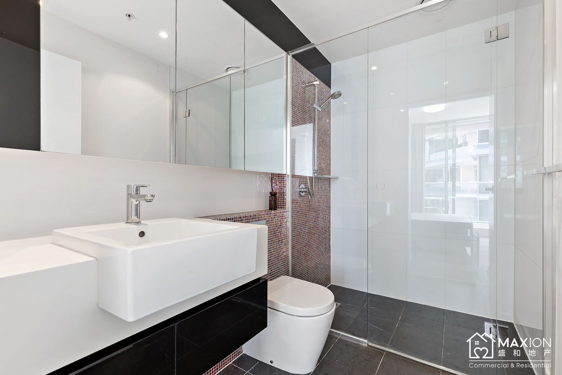 Sleek, fully tiled central bathroom